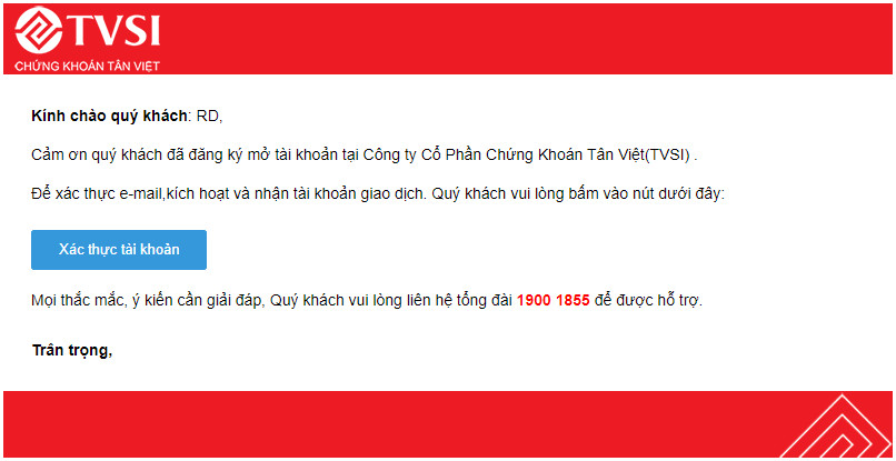 Tại email TVSI gửi cho Bạn -> Chọn "Xác thực tài khoản" để mở link