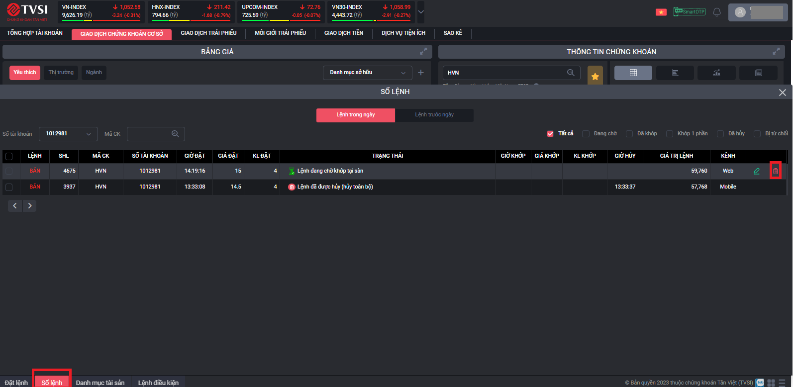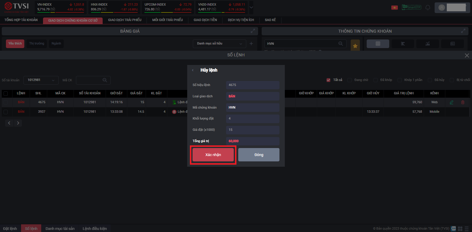 Để hủy lệnh đã đặt trên App TVSI Mobile/ Webtrading iTrade, Bạn vui lòng thực hiện theo màn hình hướng dẫn thao tác: