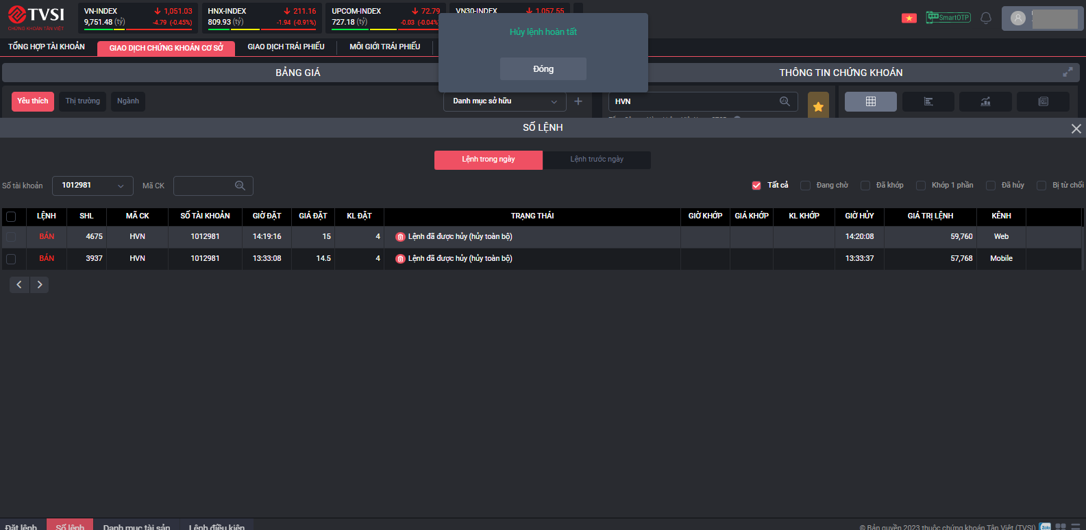 Quy định hủy lệnh tại các sàn giao dịch chứng khoán: ► Sàn Hồ Chí Minh (HOSE) tại đây ► Sàn Hà Nội (HNX) tại đây ► Sàn Upcom tại đây