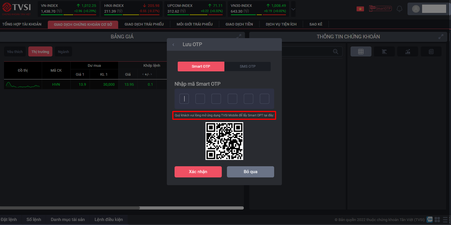 Cách 1: Chọn "Smart OTP" -> vào APP TVSI Mobile để nhận mã Smart OTP