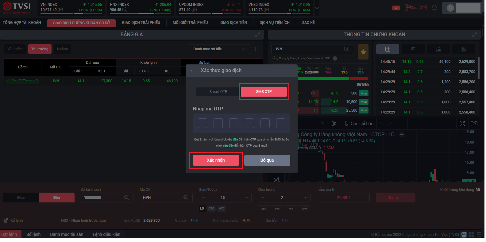 Cách 1: Chọn "Smart OTP" -> vào APP TVSI Mobile để nhận mã Smart OTP