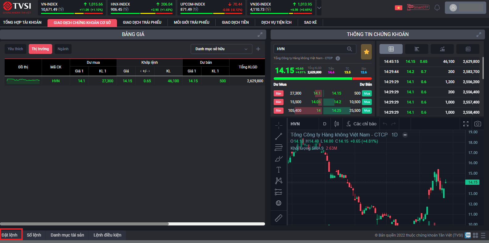 Chọn "Giao dịch chứng khoán cơ sở" -> Chọn "Đặt Lệnh"