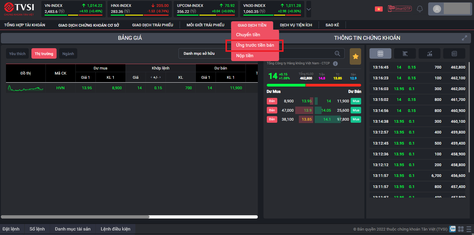 Để thực hiện ứng trước tiền bán trên Webtrading iTrade, Bạn vui lòng thực hiện theo màn hình hướng dẫn thao tác |