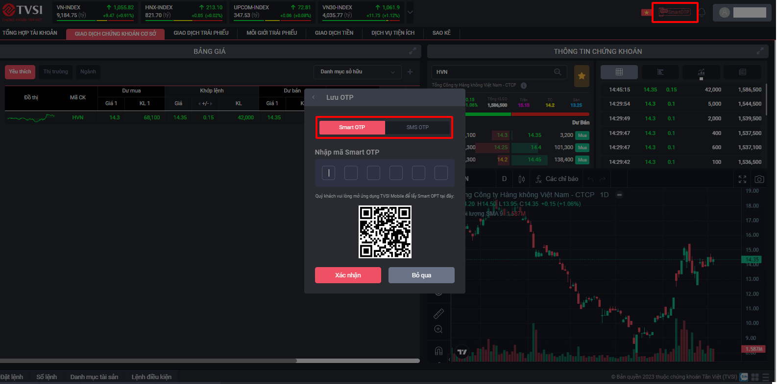 Cách 1: Chọn "Smart OTP" -> vào APP TVSI Mobile để nhận mã Smart OTP