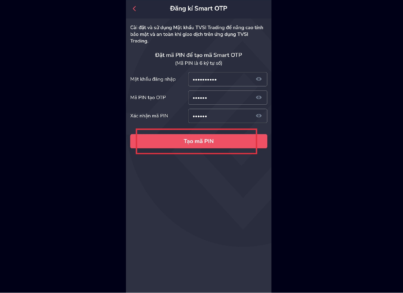 Điền Mật khẩu đăng nhập, mã pin tạo Smart OTP mới gồm 06 số