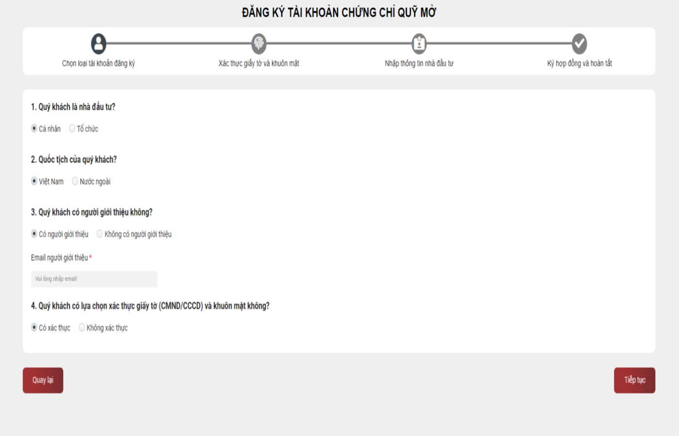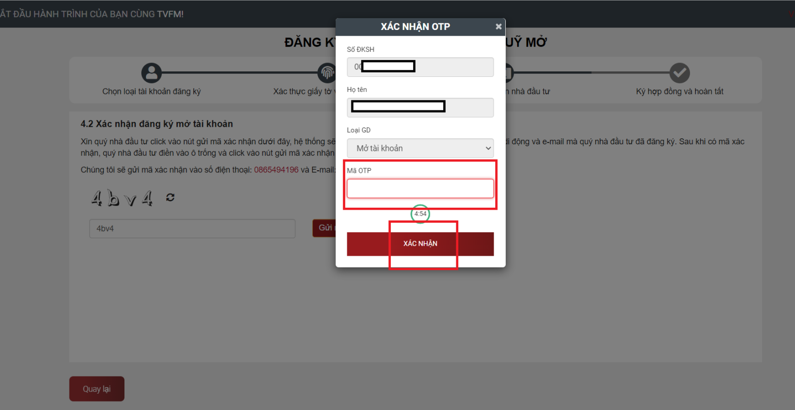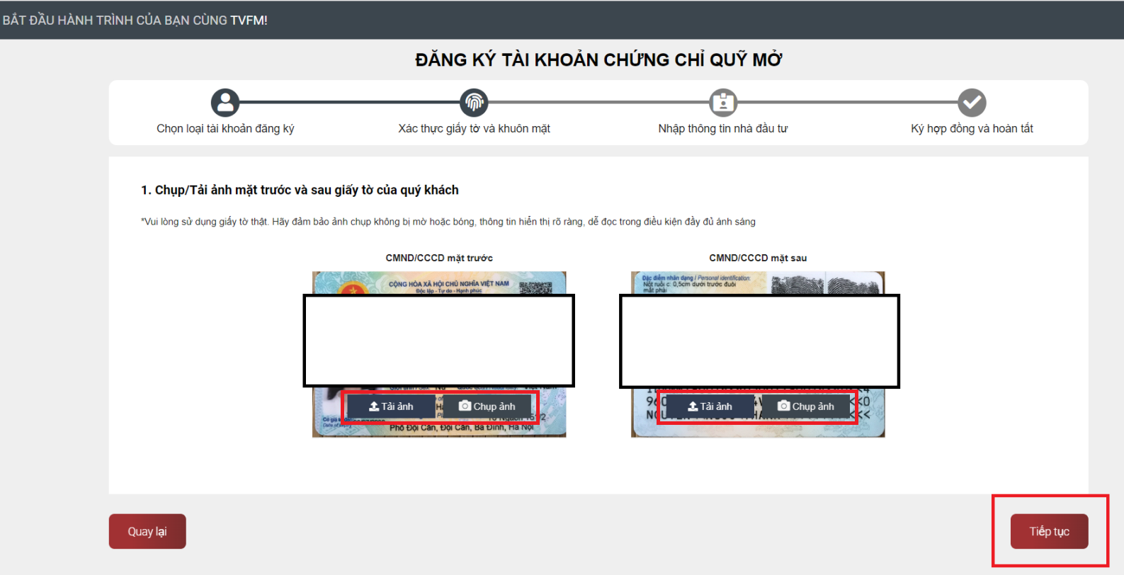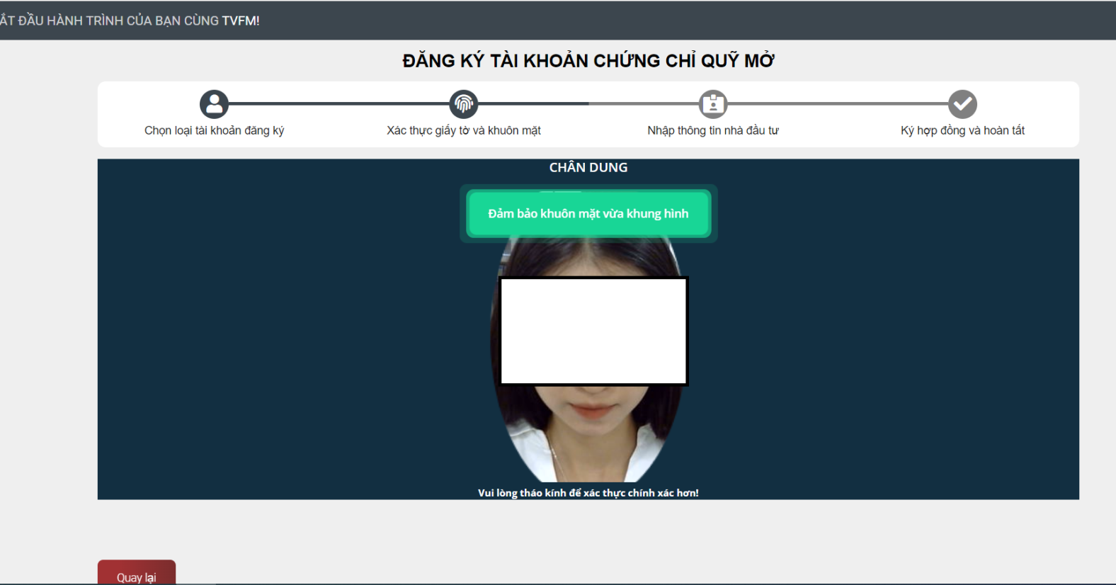 Mở tài khoản qua Website TVFM : thao tác trên điện thoại, Laptop, máy tính có thiết bị camara, Bạn vui lòng thực hiện theo màn hình hướng dẫn thao tác (như trên)