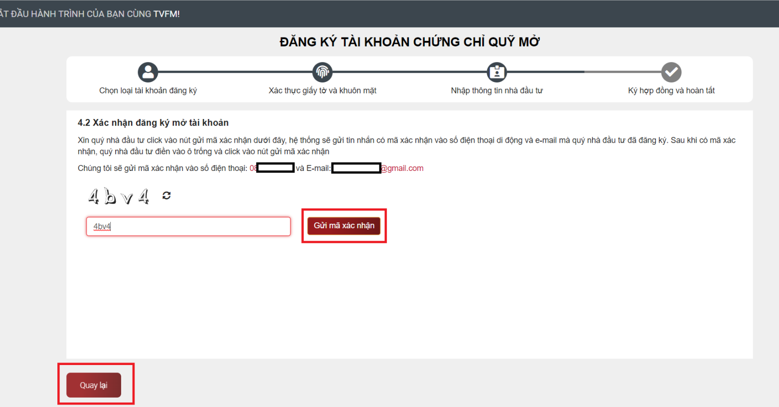 -> Chọn Gửi mã xác nhận, sau đó hệ thống sẽ gửi mã xác nhận OTP về SĐT và Email.