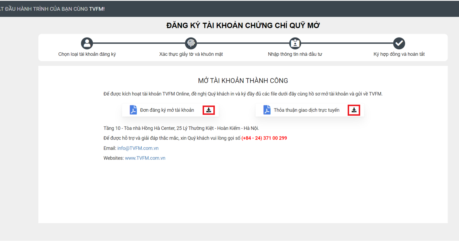 Tải và ký " Đơn đăng ký mở tài khoản", "Thỏa thuận giao dịch trực tuyến"