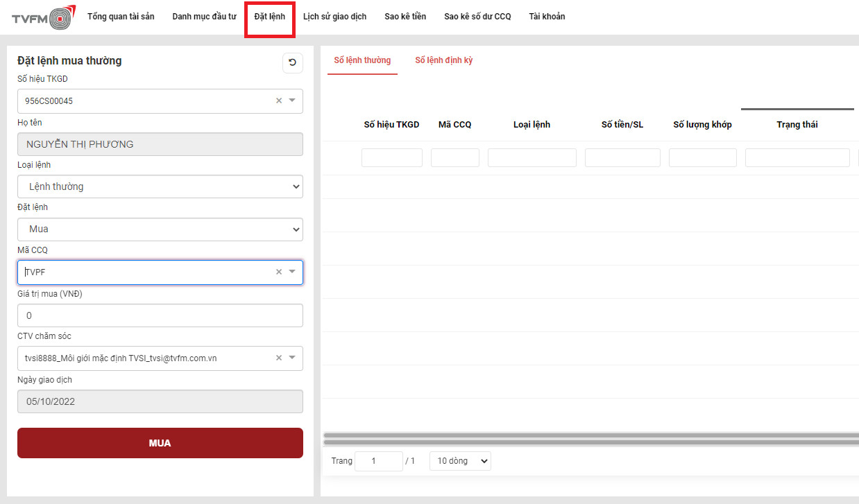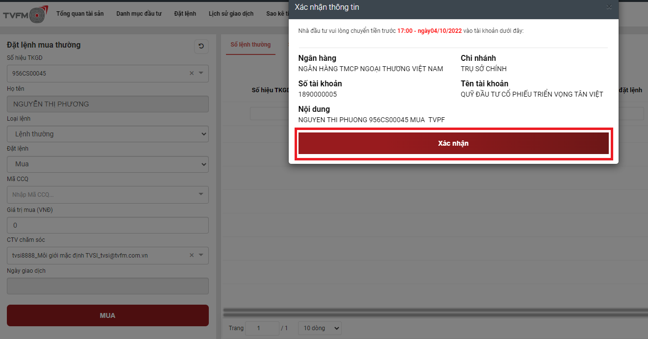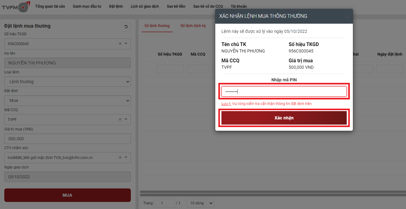 -> Nhập Loại lệnh - Mã chứng chỉ quỹ - Giá trị mua/bán (VNĐ)