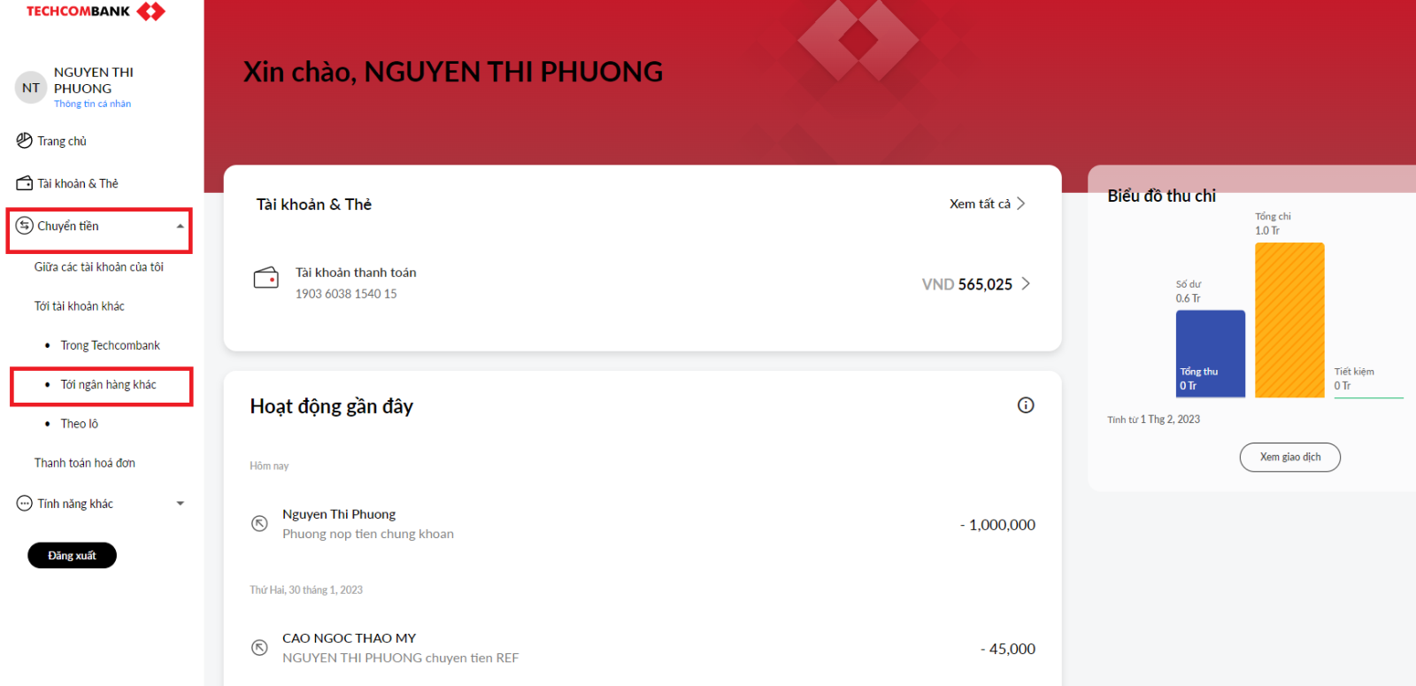 -> Chọn Chuyển tiền, chọn Tới ngân hàng khác