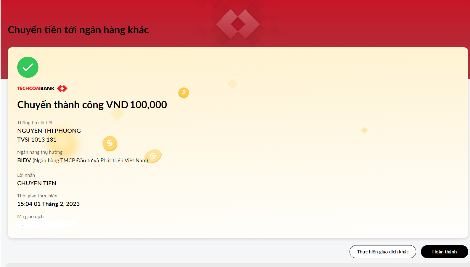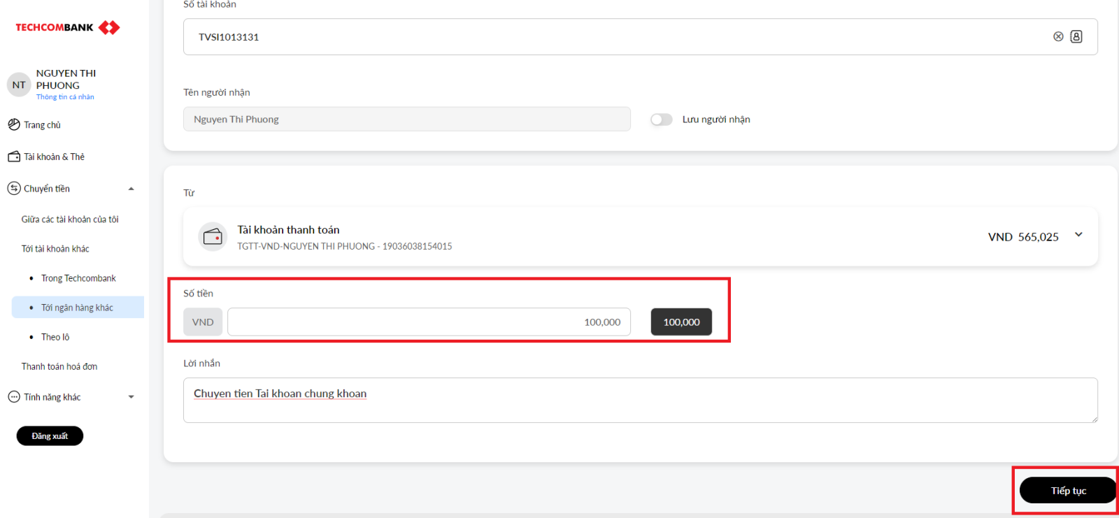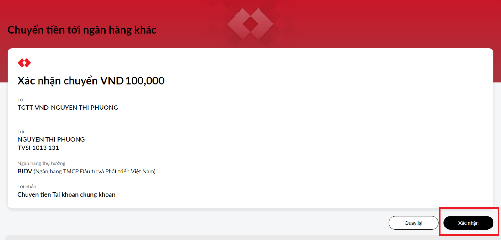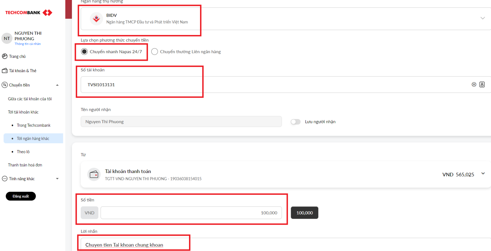 | Nộp tiền từ Techcombank sang tài khoản định danh của TVSI tại BIDV |